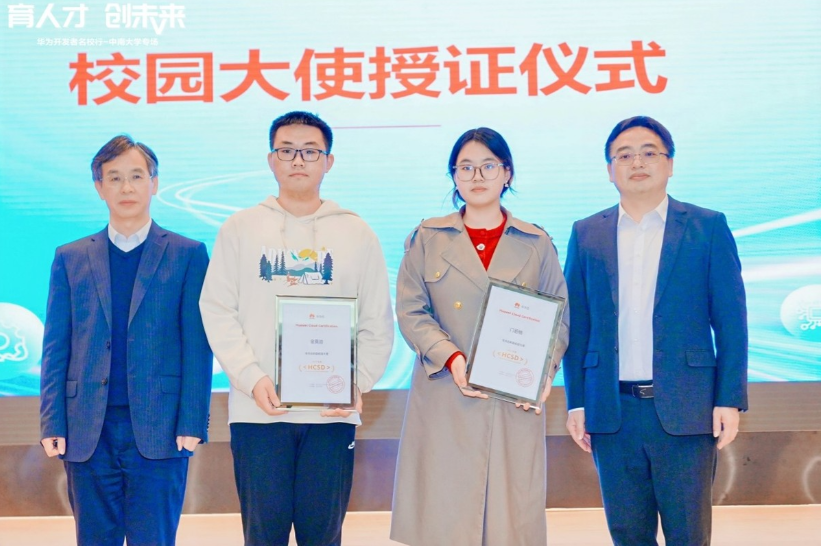 华为云员工开发者计划(HCSD)作为推动高校技术人才培养与行业前沿技术接轨的重要平台,依托校园大使团队,搭建起了高校师生与华为云的深度交流桥梁,致力于为云计算领域培育储备创新型人才,助力我国数字经济高质量发展。经严格选拔,6776永利集团金莫迪、门若楠两位同学凭借优异的学业成绩、扎实的专业素养、丰富的技术实践经验,以及对华为企业文化的高度认同,从众多候选人中脱颖而出,正式成为华为云校园大使团队成员。会上,也举行了校园大使授证仪式,6776永利集团党委常委、副董事长方勇纯与华为云开发者联盟与云商店部部长王希海为校园大使颁发证书。