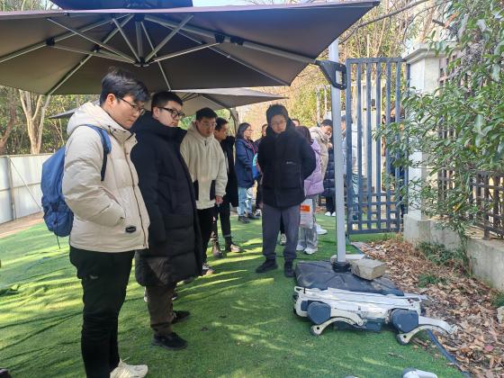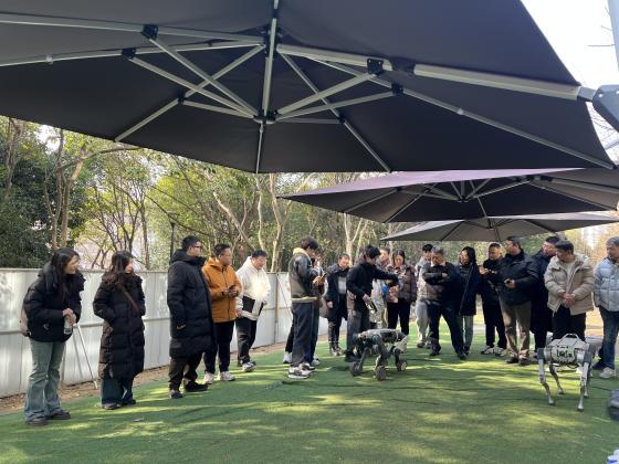 次日,师生一行前往云深处科技股份有限公司,探访这家深耕具身智能技术创新与行业落地的国家级高新技术企业。在企业展厅,负责人围绕公司发展历程、核心技术布局,详细解读了“感知-决策-执行”全链路具身智能技术体系,其核心研发成果曾荣登《Science Robotics》期刊封面,多项关键性能指标跻身全球领先行列。随后,师生移步户外演示区,现场观摩绝影X30四足机器人的动态演示,该机器人在崎岖路面、陡坡等复杂地形中,灵活完成障碍跨越、斜坡攀爬,即便遭遇突发外力干扰也能快速稳定复位,充分展现出卓越的抗扰动能力、自主导航与环境适配能力。在生产车间,大家近距离观摩四足机器人、轮足机器人“山猫”及人形机器人DR01的精密组装与性能测试全流程,了解到企业率先在全球实现四足机器人变电站全自主巡检商业化落地,产品已覆盖全国26个省市,服务100余家工业与能源企业,更成功进驻新加坡国家电网项目,实现国产四足机器人海外行业应用零的突破。